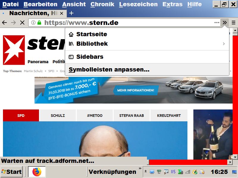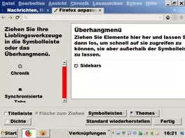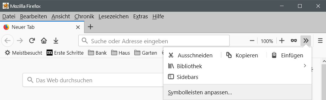 von 800 x 600 betreiben. Das hat beim Fuchs 59 zu Folge, das viel genutzte Symbole wie "Startseite" oder "Donwloads" nicht in der Symbolleiste auftauchen, sondern unter "mehr Werkzeuge" abtauchen, was ich sehr unkomfortabel finde.