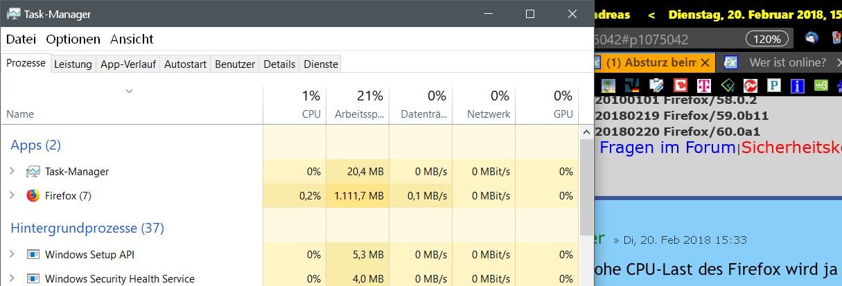 seit FF 57 (mittlerweile 58.0.1) kann ich ihn kaum mehr korrekt schließen. Das Ding hat nach ein, zwei Stunden Betrieb bei einer Handvoll Tabs 5-6 Einträge im Windows Task-Manager, die zusammen bis zu über 1 GB RAM und bis zu 50% der CPU meines brustschwachen Netbooks rauben, sodaß der FF während der Arbeit dauernd stockt ("keine Rückmeldung"), und sobald er dann wieder reagiert, kommt ein paar Minuten nach dem Klick aufs X statt der Erlösung eine Absturzmeldung.