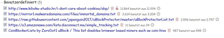 uBlock₀ / Benutzerdefiniert sind hier in meinem Arbeitsprofil noch 4 weitere Filterlisten in Anwendung.Codehttps://jspenguin.com/NanoAdblocker/AssetsMirror/NanoBase.txt https://raw.githubusercontent.com/jspenguin2017/uBlockProtector/master/uBlockProtectorList.txt https://raw.githubusercontent.com/notracking/hosts-blocklists/master/domains.txt https://raw.githubusercontent.com/notracking/hosts-blocklists/master/hostnames.txt