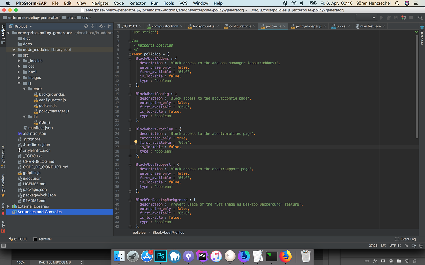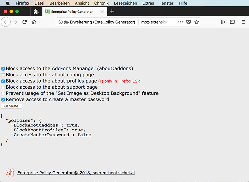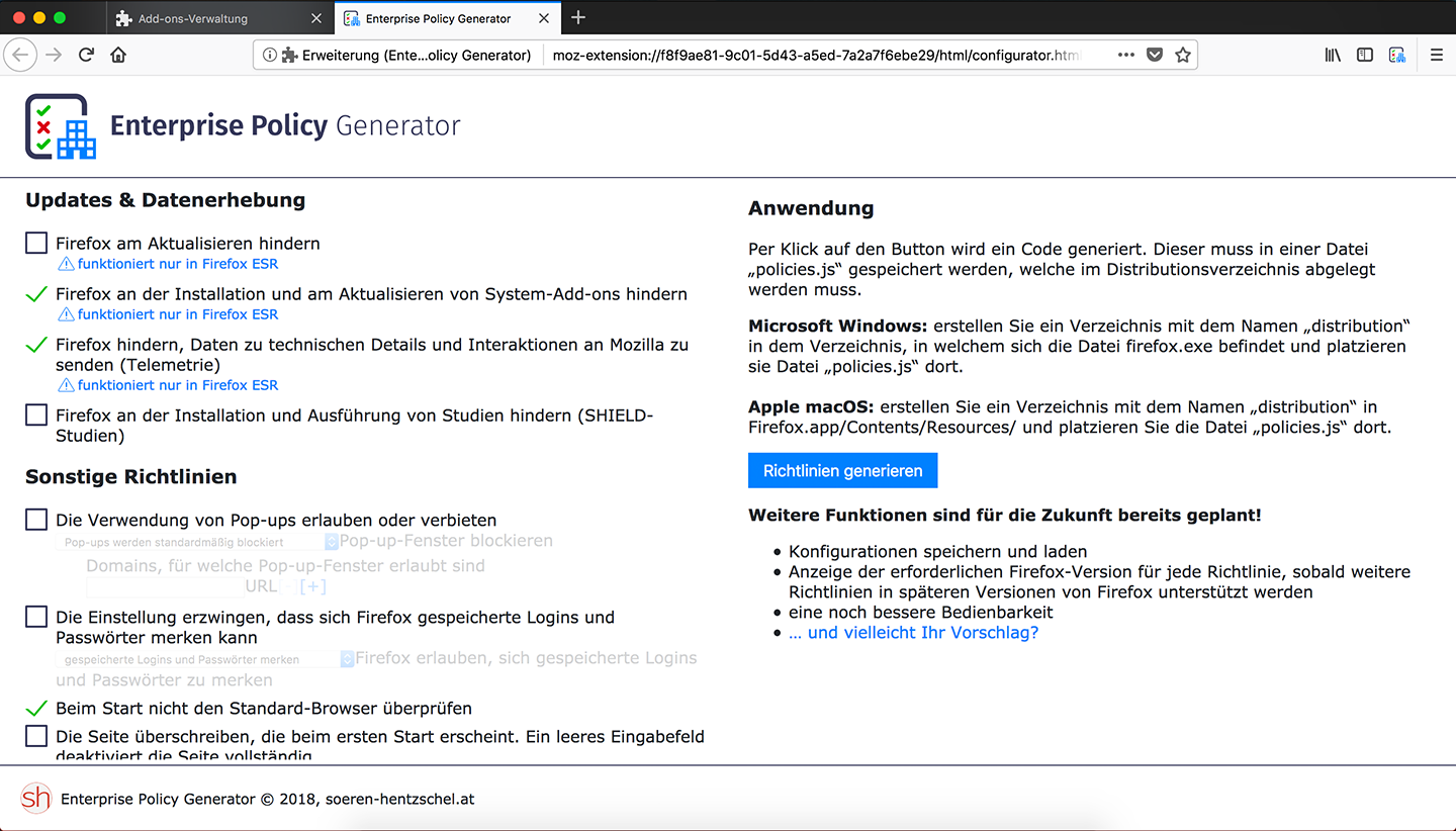 In gut einem Monat erscheint Firefox ESR 60, daher möchte ich die Gelegenheit für eine kleine Vorankündigung nutzen. Ich arbeite derzeit an einer neuen WebExtension, welche in Zusammenhang mit der neuen Policy Engine von Firefox 60 steht. Die Policy Engine wird die Konfiguration von Firefox erlauben, z.B. about:config deaktivieren, Telemetrie deaktivieren, Startseite festlegen usw., eben alles, was für Unternehmen relevant ist. Die Erweiterung generiert die Konfigurations-Datei, welche nur noch in das Installationsverzeichnis von Firefox kopiert werden muss - keine weitere Konfiguration notwendig! Meine Erweiterung Enterprise Policy Generator wird damit quasi ein inoffizieller Nachfolger des CCK2 Wizards werden, für die Generation Firefox Quantum.