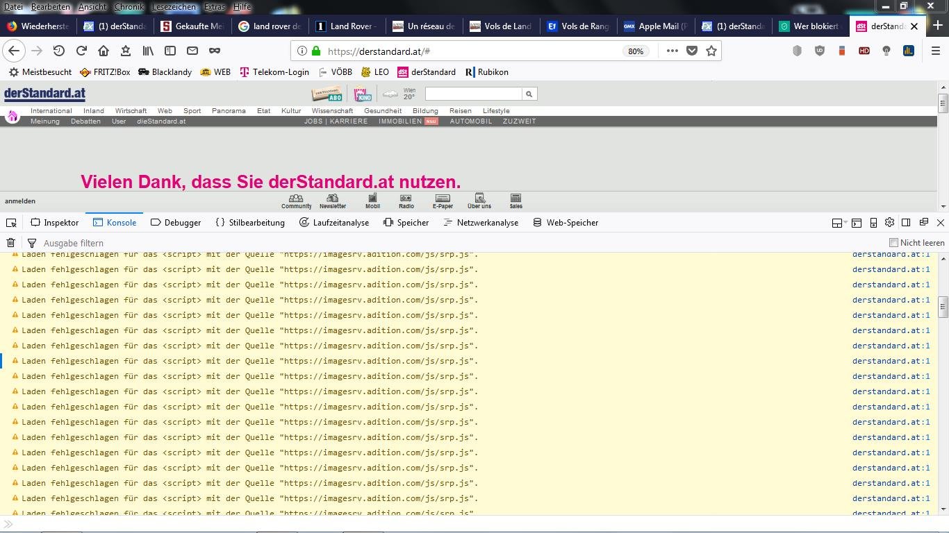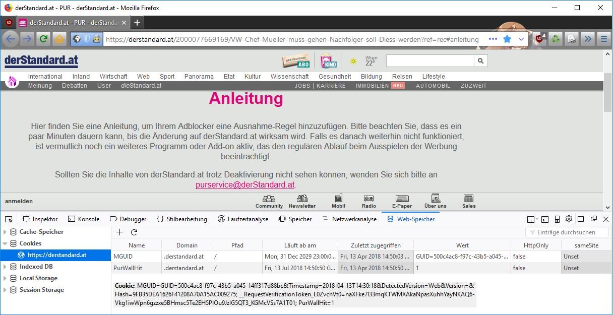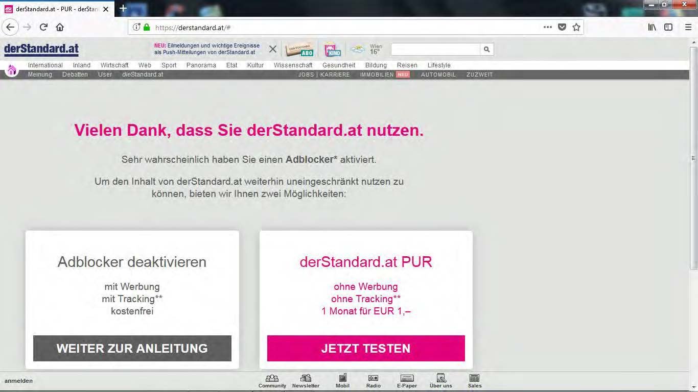 Trotzdem bekomme ich beim Aufruf der Seite https://derstandard.at/ die Meldung „Wahrscheinlich haben Sie einen Ad-Blocker installiert“