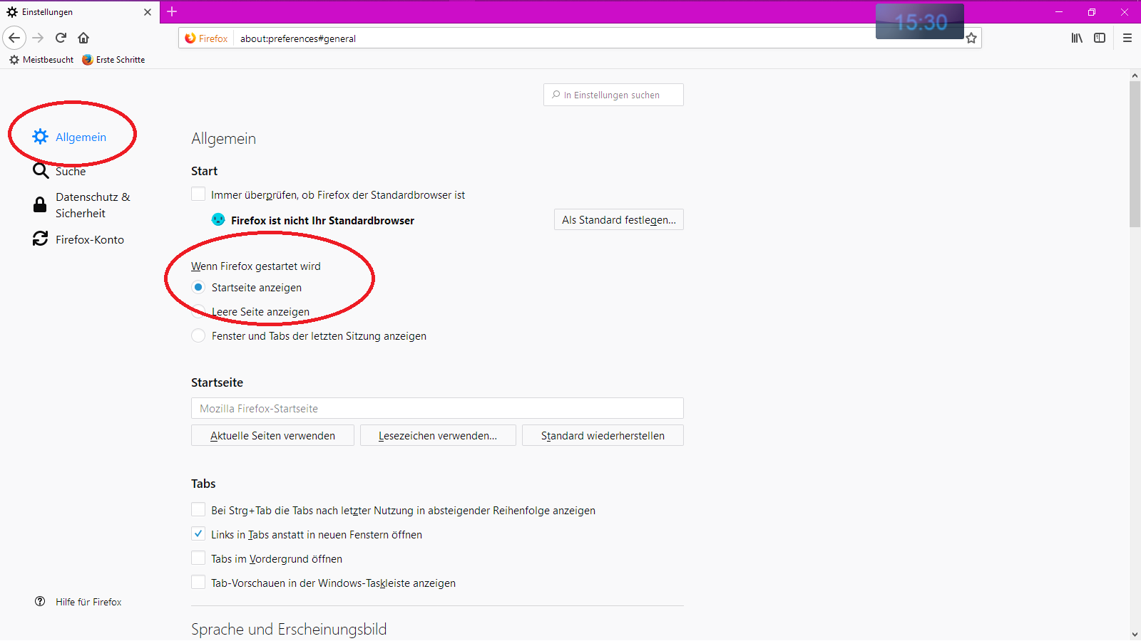 • Rufe die Einstellungen allgemein auf (about:preferences#general ; Bild 1)