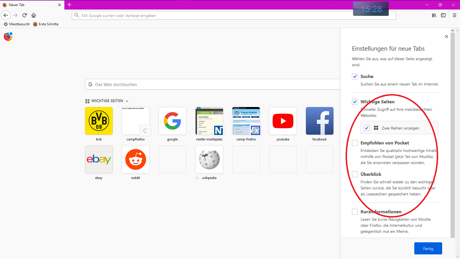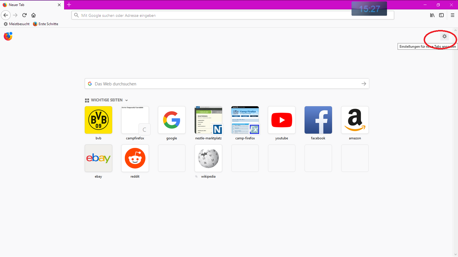 Natürlich gibt es das Zahnrädchen, oben rechts auf der Seite. Aber nur auf der Neuer-Tab-Seite about:newtab, aber nicht, wenn du irgendeine Webseite in einem neuen Tab öffnest. Die Neue-Tab-Seite ist die Standard-Startseite von Firefox.