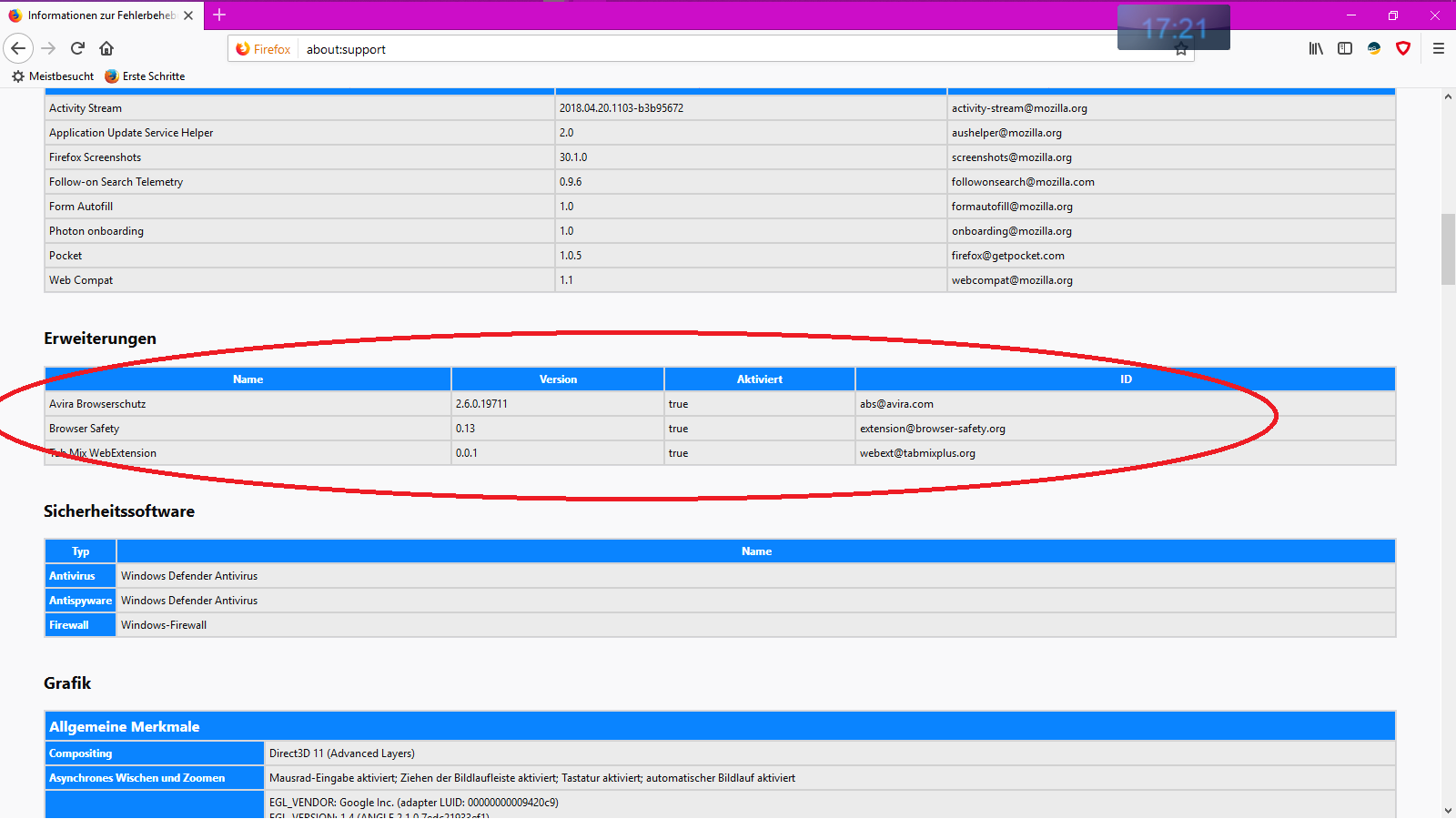 • Interessant wäre der genaue Versionsname und die ID, welche in aboout:support bei Bastian angegeben ist bei der Erweiterung.