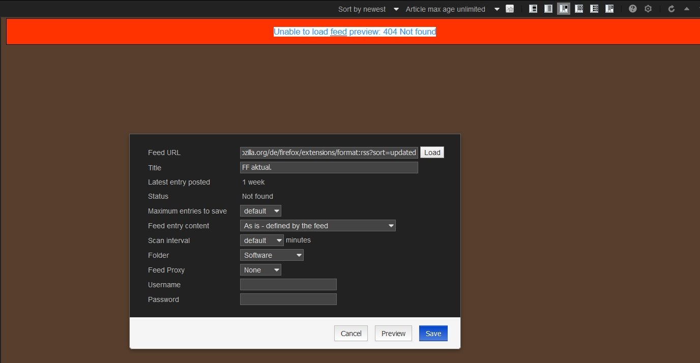Sobald ich bei der Einrichtung eines Feeds auf "Preview" klicke bekomme ich einen roten Balken innerhalb des Feedbrofenster mit einen Hinweis: "Unable to load feed preview: 399 Connection timeout" zu sehen.