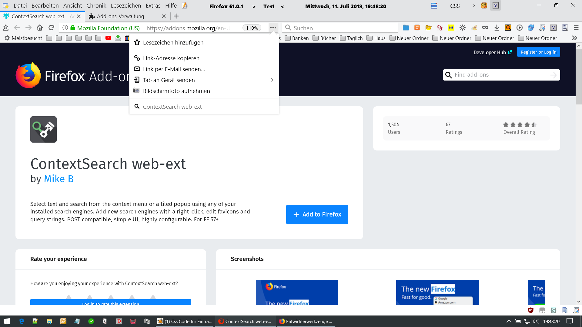 Der letzte davon testet auf die gesamte ID und hätte also auch auf die eher übliche Weise geschrieben werden können:Codemenuitem#screenshots_mozilla_org-menuitem-_create-screenshot { /* … */ } /* oder noch kürzer ohne "menuitem" */*) Zur Klarstellung: Es stimmt, dass an diese Addon-ID’s eine individuelle Zeichenkette angehängt ist, die sich von Profil zu Profil unterscheiden kann – und viel schlimmer, mir selbst schon passiert (und deshalb kam ich auf die Idee, die allgemeinere Syntax zu verwenden): Sie kann sich bei einem Addonupdate auch innerhalb desselben Profils ändern.