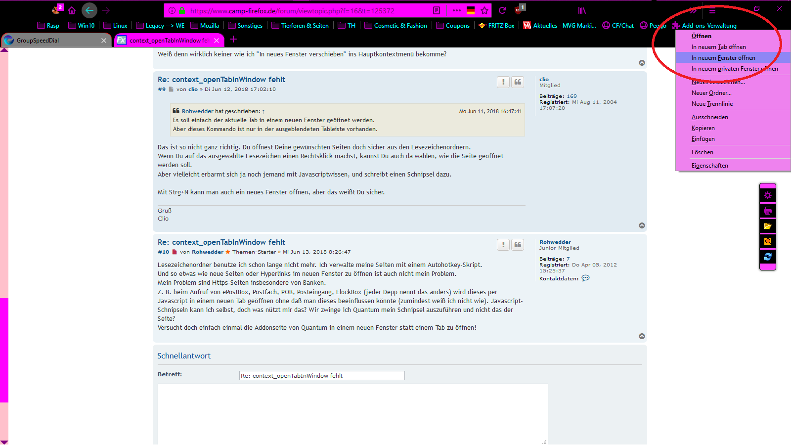 Solche Tabs möchte ich (stellvertretend mein Autohotkeyskript) umgehend in neue Fenster verschieben können und dafür benötige ich den Befehl context_openTabInWindow auch bei ausgeblendeter Tableiste.Für die Lesezeichen-Symbolleiste ist mir der Monitorplatz zu schade, die IE-Favoritenverwaltung ist besser.