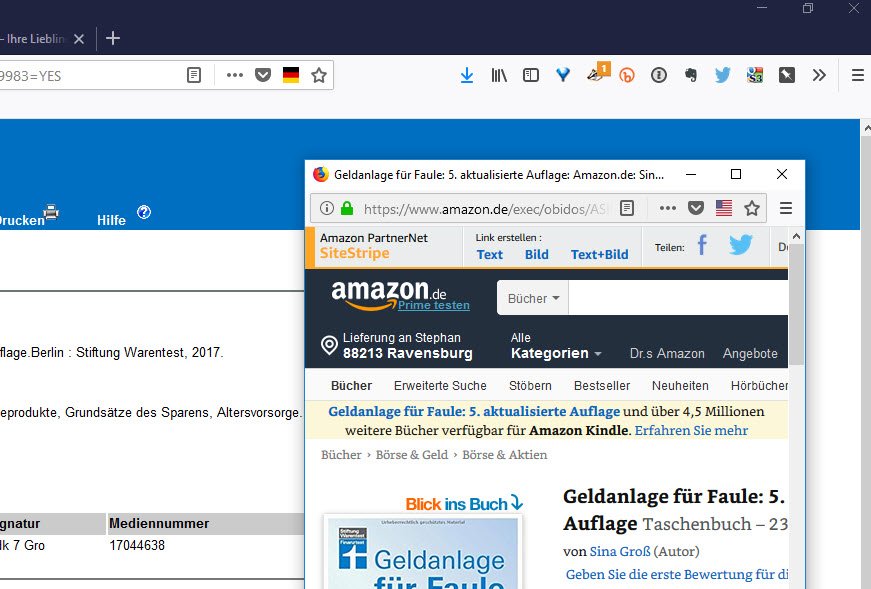 wenn ich ein Bild auf den Suchergebnissen unserer Stadtbüchereei anklicke, öffnet sich ein neues Fenster von Amazon. Dort fehlen allerdings sämtliche Navigationselemente (s. Bild). Ich würde gerne diese neue Seite als Tab angezeigt bekommen. In Chrome ging das einfach: Kontextmenü - Als Tab anzeigen - Fertig.