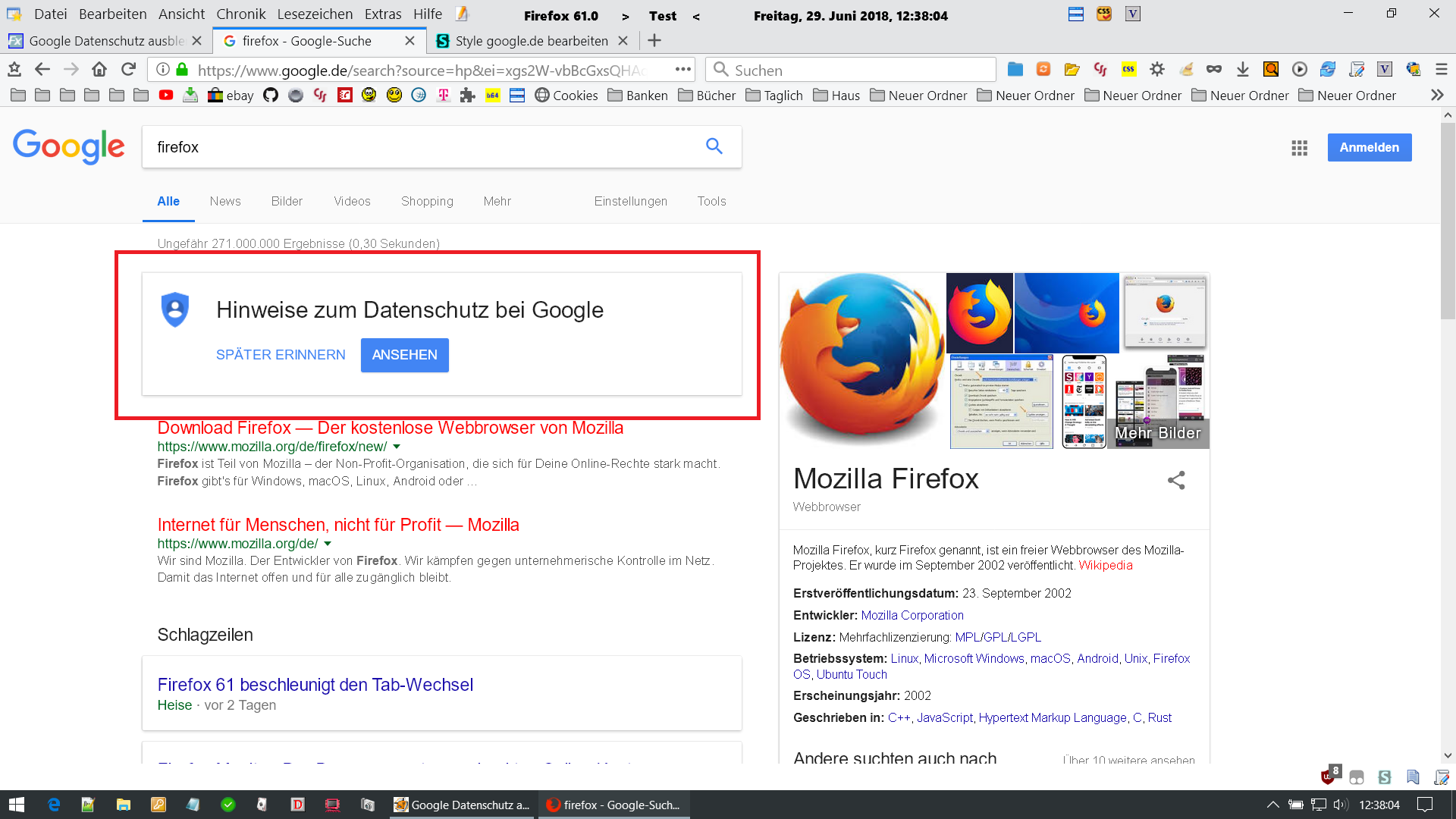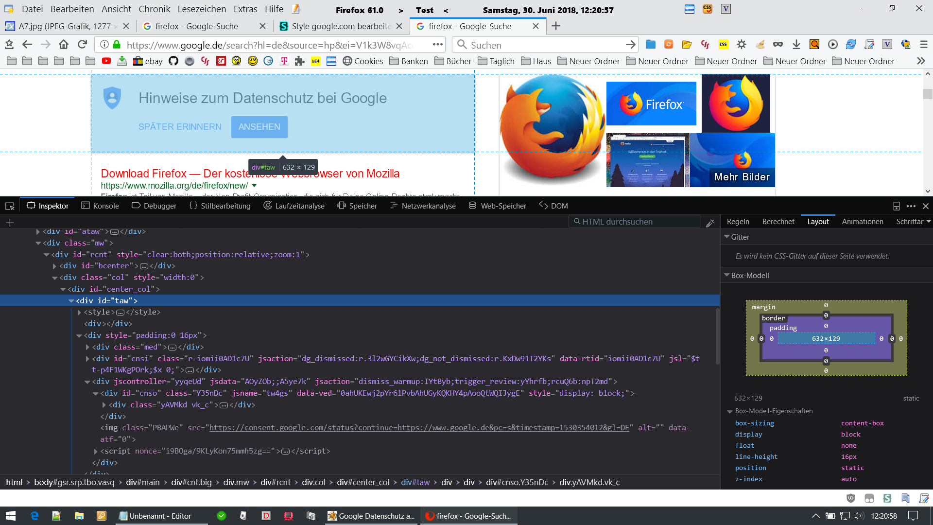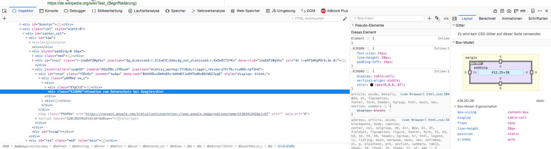 Dann mach bitte einen Rechtsklick darauf und wähle "Element untersuchen". Mach das Fenster der Entwicklerwerkzeuge dann ruhig größer, damit wir von der Element-Struktur möglichst viel sehen. Mach davon einen Screenshot und stell den hier rein. Das sollte dann ungefähr wie in meinem Screenshot aussehen.