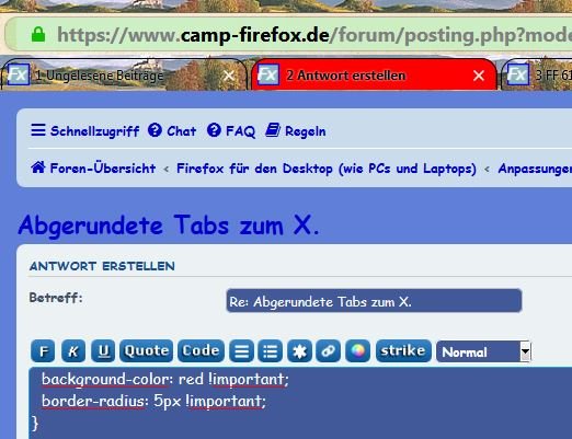 Die verschiedentlich vorgeschlagenen Anpassungen für abgerundete Tabs sehen hier (Win7, KEIN Aero-Theme o.ä.) alle nicht so toll aus. Meine davon abgeleitete Lösung: