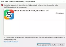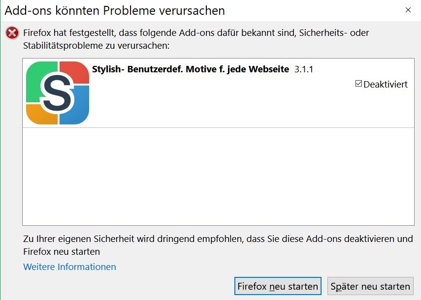in meiner addonliste steht auch "stylish ist bekannt als ursache für sicherheits- und stabilitätsprobleme"