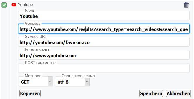Ich habs genauso ausgefüllt und wenn ich damit ein Wort einer Seite markiere und per Rechtsklick im Kontextmnü suche, dann geht Youtube im neuen Tab auf, allerdings bleibt das Feld "Suchen" auf Youtube leer und nur die Suchergebnisse werden mir angezeigt.