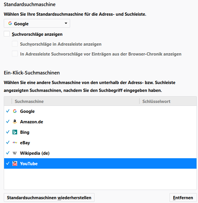 • Hast Du wirklich keine einzige Suchmaschine installiert? Nicht mal die, die standardmäßig bei Firefox dabei sind?