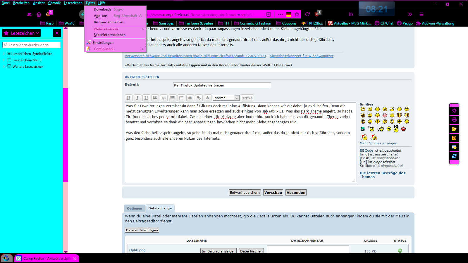 • Was für Erweiterungen vermisst du denn ? Gib uns doch mal eine Auflistung, dann können wir dir dabei ja evtl. helfen. Denn die meist genutzten Erweiterungen kann man schon ersetzen und auch einiges von Tab Mix Plus. Was das Dark Theme angeht, so hat ja Firefox ein solches per se mit dabei. Zwar in einer Lite-Variante aber immerhin. Auch ich habe das von dir genannte Theme vorher benutzt und vermisse es dank ein paar Anpassungen, auf der Dark-Basis mit Magenta und Cyan, inzwischen nicht mehr. Siehe angehängte Bilder.