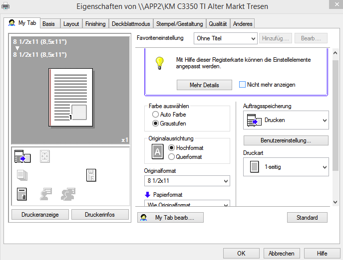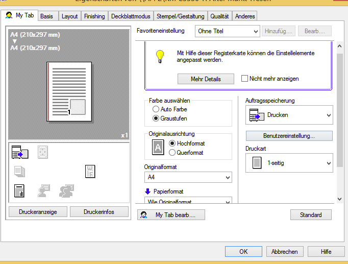 Ich habe im Druckermenü unter Datei/Drucken/Eigenschaften/MyTab und Layout gesehen, dass dort 8 1/2"x 11 als Originalformat eingestellt ist. Wenn ich das in A4 ändere, und etwas ausdrucke, dann ist bei nächsten Aufruf der Eigenschaften alles wieder zurück auf 8 1/2"x 11 eingestellt. Den Tab "Erweitert" habe ich unter Layout nicht gefunden.