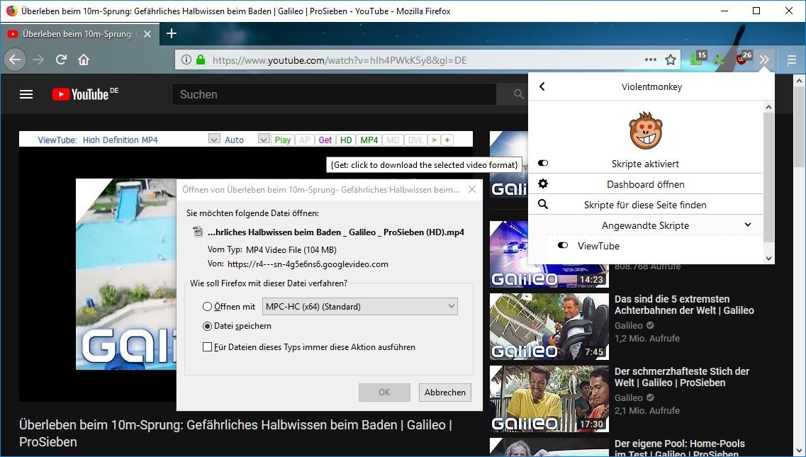 Get: click to download the selected video format genügt - media.mediasource.enabled auf false umstellen braucht es mit dem userscripts ViewTube nicht. Bei Bedarf einfach einschalten oder wieder ausschalten und anschließend Aktuelle Seite neu laden.