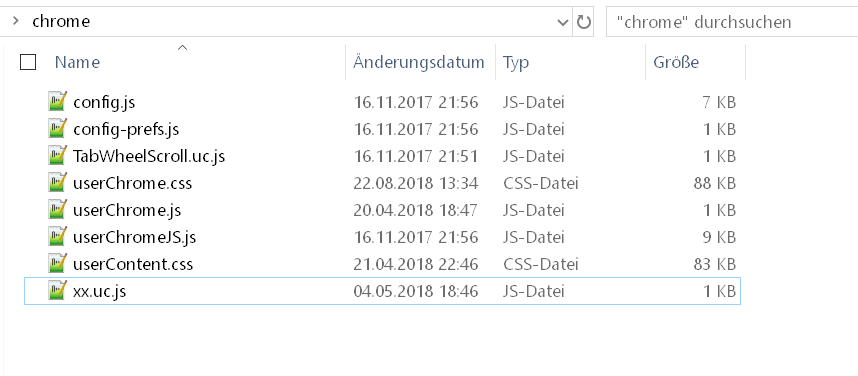 Sowohl Benutzer-Skripte (Dateien mit der Endung uc.js) als auch die Dateien userChrome.css und userContent.css für CSS-Code sind im Ordner Chrome. Bei Skripten gibt es aber außerdem noch Dateien im Installationsordner von Firefox, insofern ist es schon wichtig zu wissen, was du verwenden willst.