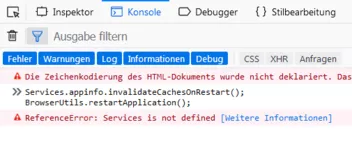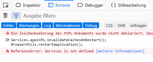 Oder, vielleicht einfacher, Folgendes in die Browserkonsole eingeben, dann wird der Skriptcache gelöscht und Firefox startet neu: