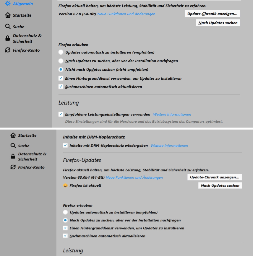 „Nicht nach Updates suchen (nicht empfohlen)“ geblieben