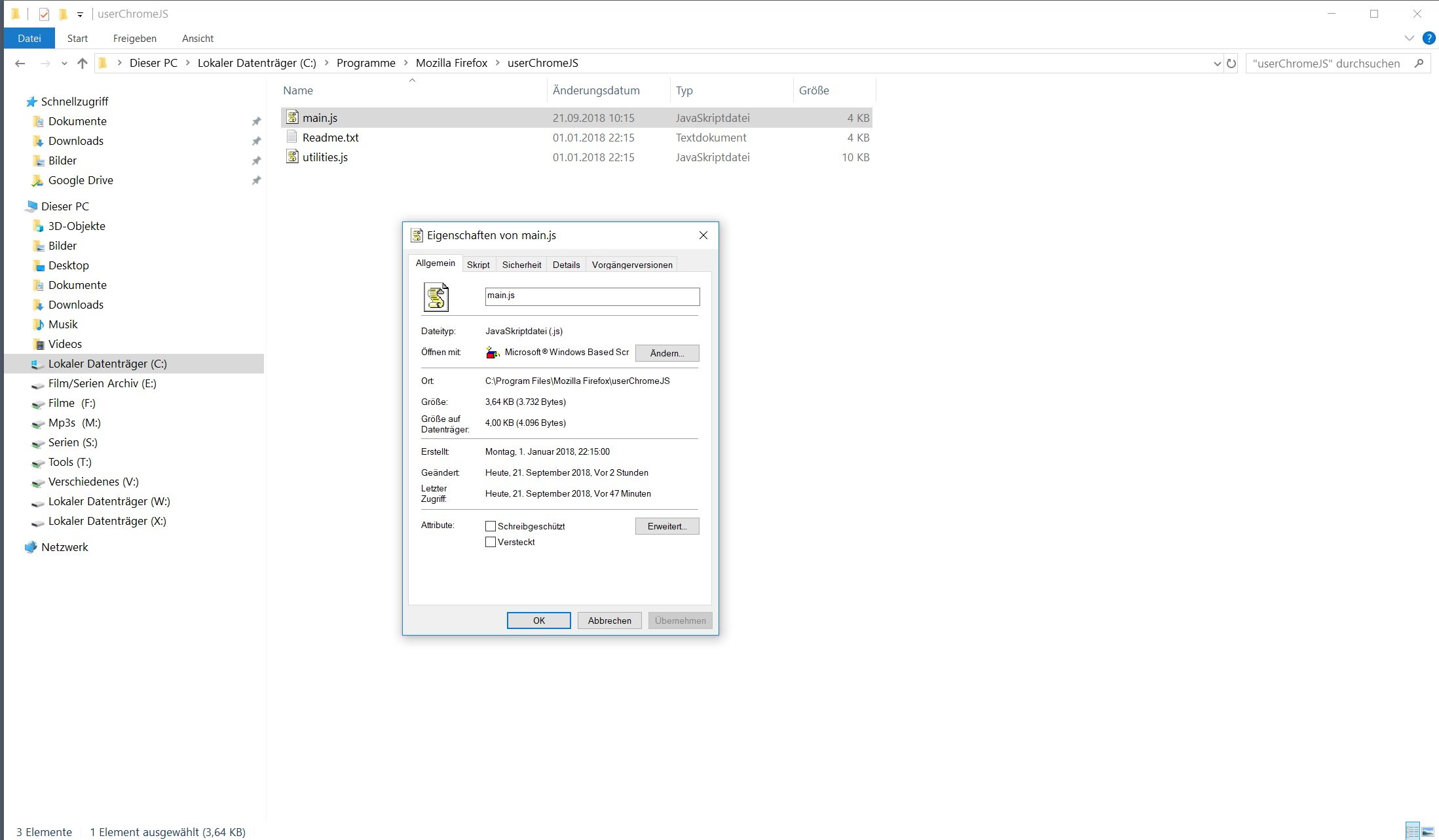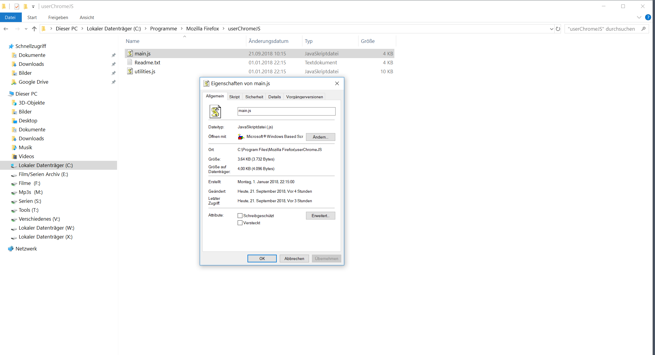 --> Screenshot des Ordners userChromeJS mit den Eigenschaften der main.js
