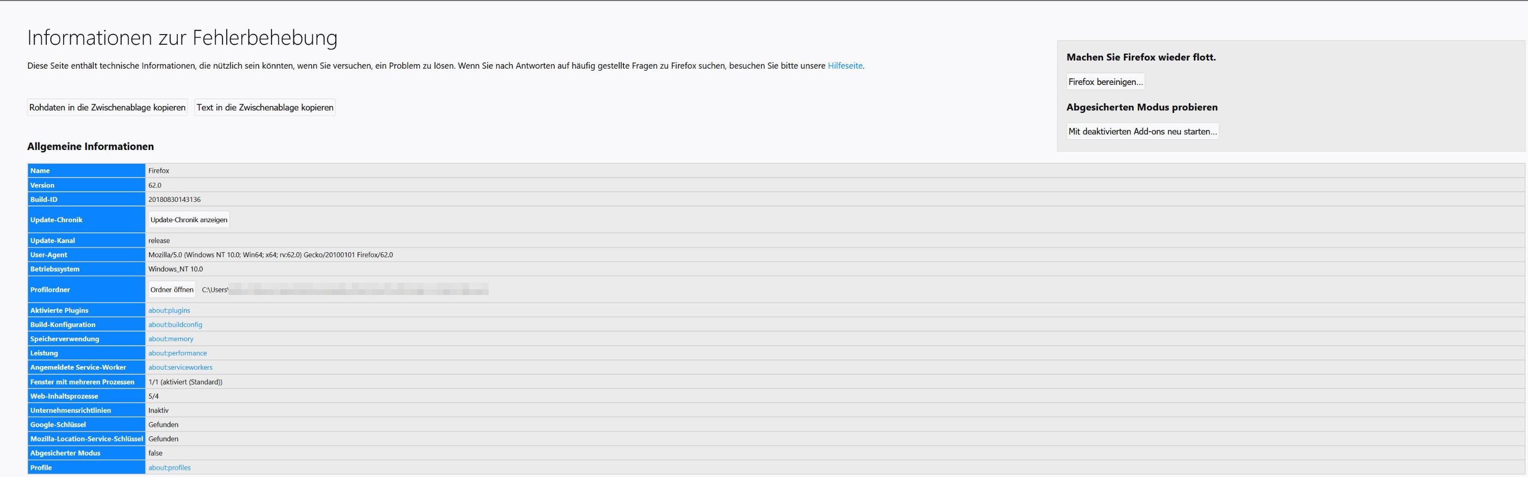 --> Screenshot der oberen Hälfte der Informationen zur Fehlerbehebung (about:support)