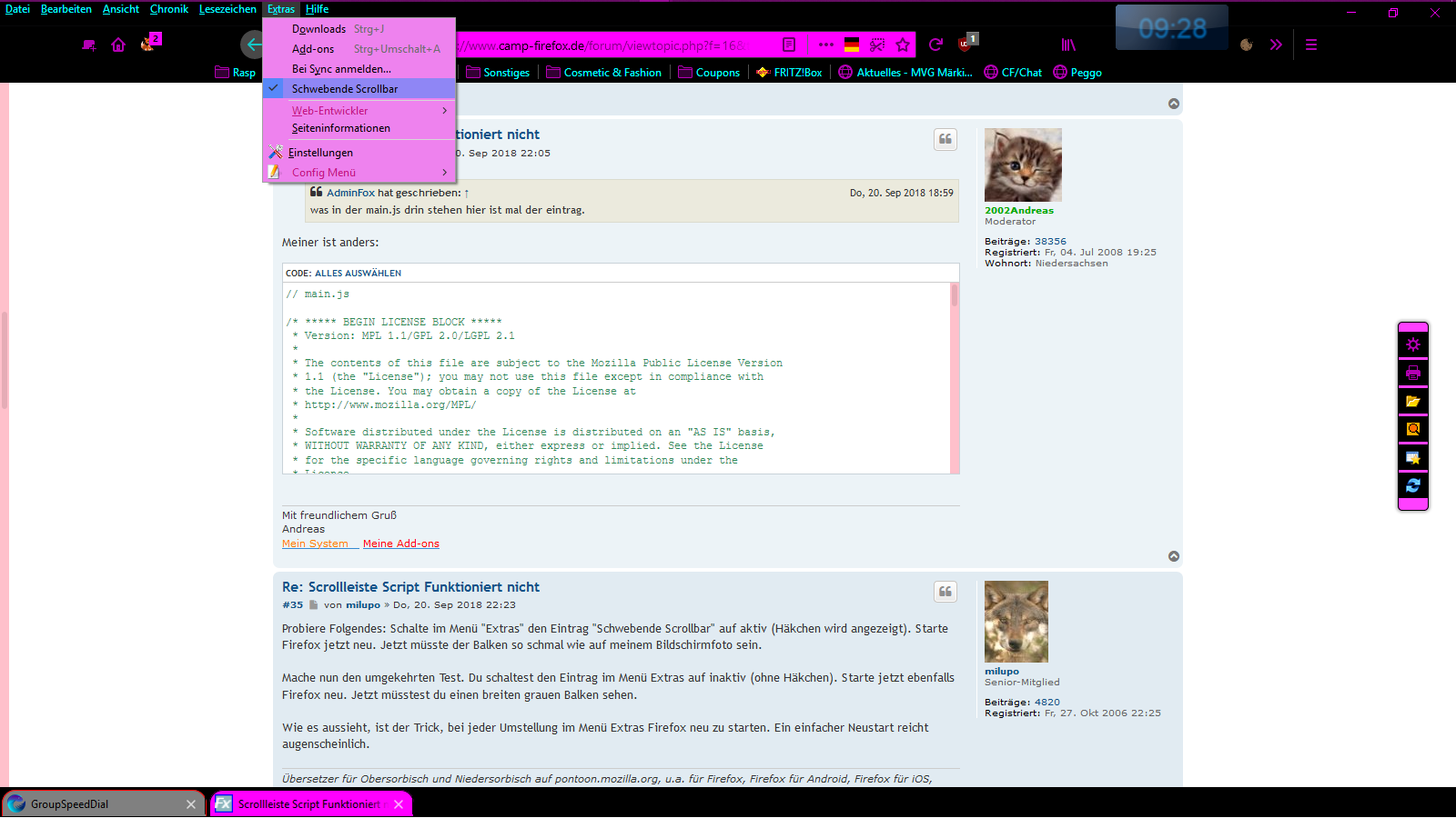 Ausserdem solltest du es mal ohne userChrome.css versuchen. Und wie immer dabei das Löschen des Scriptcache nicht vergessen.