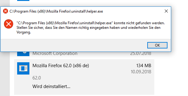 Um das ganze kurz zu fassen, war dann im Endeffekt eine "kaputte" Version von Firefox installiert, in Programme x86, obwohl es sich um ein 64-bit Windows 10 handelt (mir wurde im englischen Forum gesagt, das sei unter Umständen normal, weil angeblich bis vor einem Jahr etwa Firefox bevorzugt 32-bit gewesen sei und sich dann als 64-bit-Installation auch weiterhin in den x86-Ordner installiert hätte). In der Liste der installierten Programme war es als x86 gelistet, jedoch ohne Icon, bei einem Deinstallationsversuch von dort passierte einfach gar nichts.