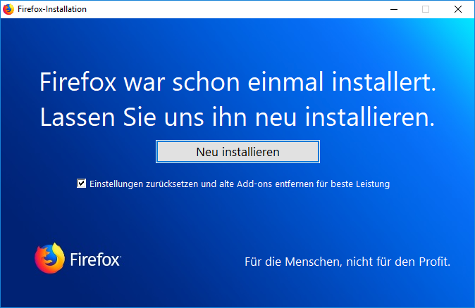 Bevor mir jemand empfiehlt, das System zu scannen (vielleicht mach ich das aus Interesse mal, werde es aber wahrscheinlich neu aufsetzen), ich möchte wirklich einfach nur wissen, ob dieses Verhalten legitim ist, ob es also irgendeinen Fall gibt, wo Firefox sich tatsächlich nach AppData installiert, und ob jemand dieses komische Fenster schonmal gesehen hat.