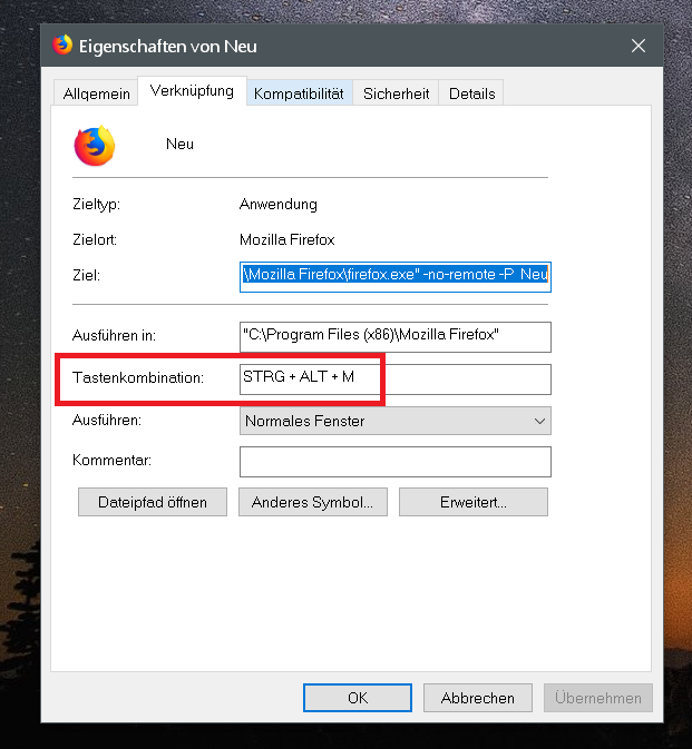Ich bin schon fleißig am basteln, aber es funktioniert trotzdem nicht. Ich denke auch dass wir uns missverstehen, denn ich will nicht den Profilmanager gestartet haben sondern dass das gewünschte Profil sofort auf Tastendruck startet. Dann habe ich den 64-Bit FF und entsprechend ist mein Verzeichnis "C:\Program Files\Mozilla Firefox\firefox.exe" .