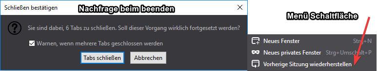 Damit aber deine geöffneten Tabs nach dem beenden von Firefox abgespeichert werden, ist diese alte Abfrage auch nicht vonnöten, da Firefox auch so immer deine letzte Sitzung abspeichert nach dem beenden.