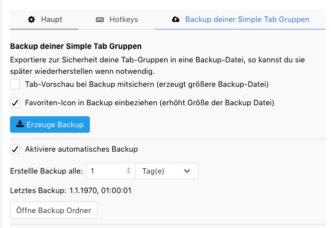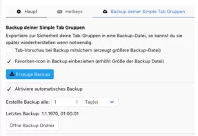 Seit dem 11.11. existiert bei mir im Download-Verzeichnis ein Unterverzeichnis namens STG-backups. Ich habe es nicht angelegt. In dem Unterverzeichnis wird jeden Tag eine Datei mit dem Namen stg-backup-JJJJ-MM-TT@drive4ik.json angelegt (immer 198 KiB). Offenbar geht es um meine Tabs.
