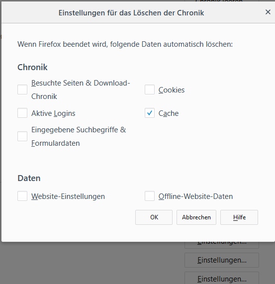 Hatte mich vielleicht nicht so verständlich ausgedrückt, aber mit der Einstellung nur Cache löschen werde ich mal testen, auch wenn ich das eigentlich nicht auf jeder Seite wollte.