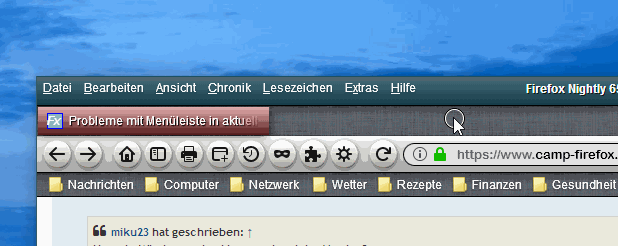 In der neuesten Version 65.0a1 (2018-11-24) funktioniert die Menüleiste nicht mehr als Titelleiste. Also bei ausgeblendeter Titelleiste und eingeblendetem Menü kann ich das Fenster nicht mehr mit der Maus verschieben. Drag&Drop bleibt wirkungslos. Habe ein vollständig neues und sauberes Profil erstellt. Auch damit das gleiche Verhalten.