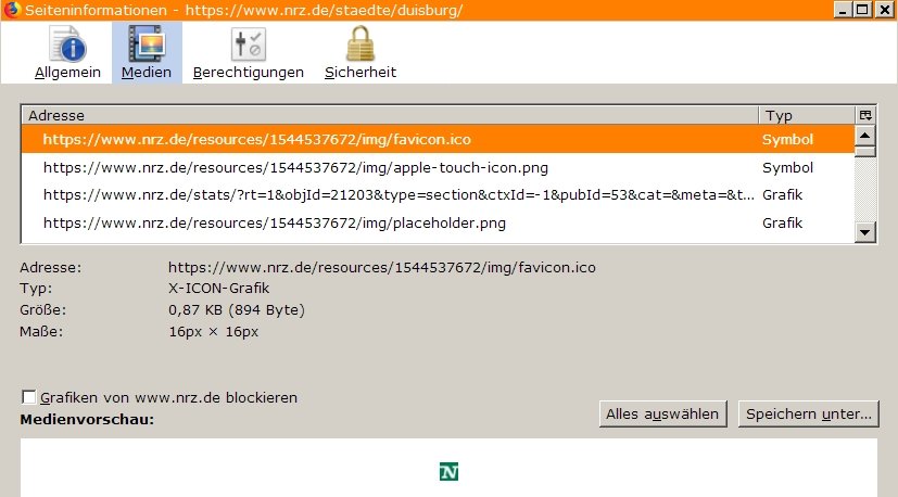 Bei https://www.nrz.de/staedte/duisburg müsste das Favicon korrekt so aussehen. Funktioniert mit einem sauberen Profil, nur in meinem Arbeitsprofil nicht.