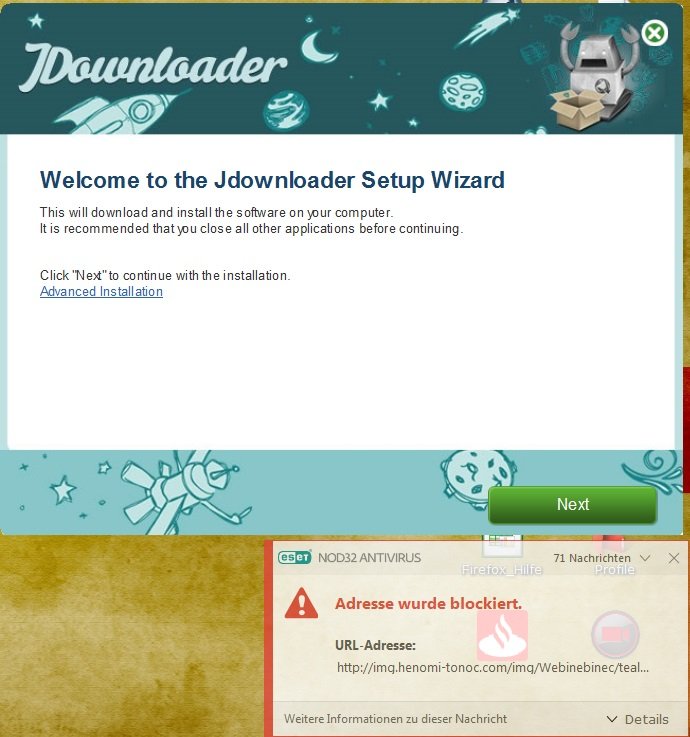 • jdownlaoder.org ist aber die offizielle Seiten und mega der gewählte Hoster. Da kannst du gerne Eset und andere zitieren, das hat keinen Einfluss auf die Relevanz, deine Schlüsse sind demnach nur lokal, deine. Von irgendwoher müssen ja die angezeigten Bilder und Texte entnommen werden.