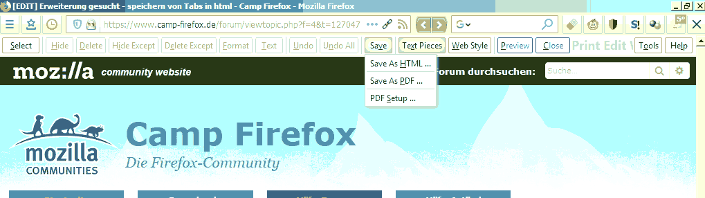 • Sorry, zum Speichern als PDF nutze ich das Addon Print Edit WE. Es stammt vom selben Entwickler, integriert sich in die Oberfläche des Addons Save Page WE, so dass ich es gar nicht mehr als eigenständiges Addon wahrgenommen hatte.