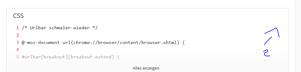 Alles anzeigen/* Urlbar schmaler wieder */ @-moz-document url(chrome://browser/content/browser.xhtml) { #urlbar[breakout][breakout-extend] { top: calc((var(--urlbar-toolbar-height) - var(--urlbar-height)) / 2) !important; left: 0 !important; width: 100% !important; } #urlbar[breakout][breakout-extend] > #urlbar-input-container { height: var(--urlbar-height) !important; padding-block: 0 !important; padding-inline: 0 !important; } #urlbar[breakout][breakout-extend][breakout-extend-animate] > #urlbar-background { animation-name: none !important; } #urlbar[breakout][breakout-extend] > #urlbar-background { box-shadow: none !important; } } -