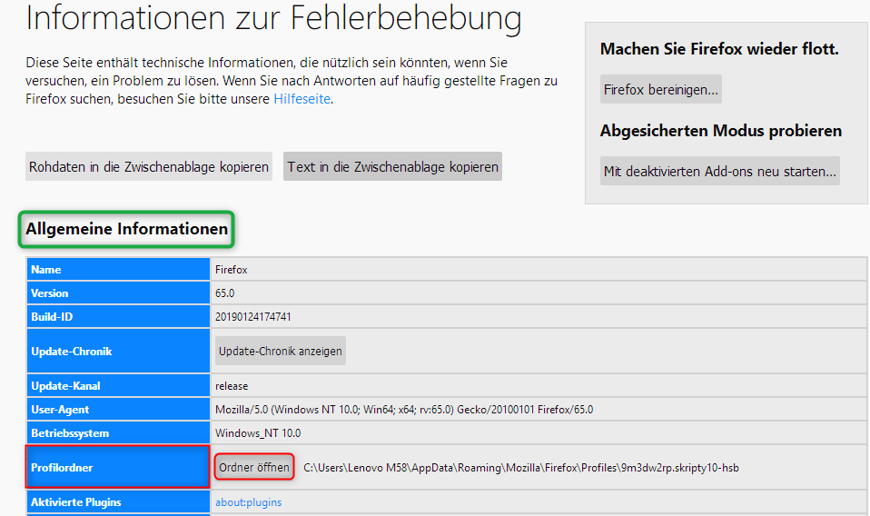 a) Wenn du nicht weißt, welches Profilverzeichnis dein aktives Profil verwendet, musst du es erst herausfinden. Dies geht am schnellsten über die Informationen zur Fehlerbehebung. Diese kannst du auf dreierlei Weise aufrufen: