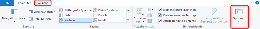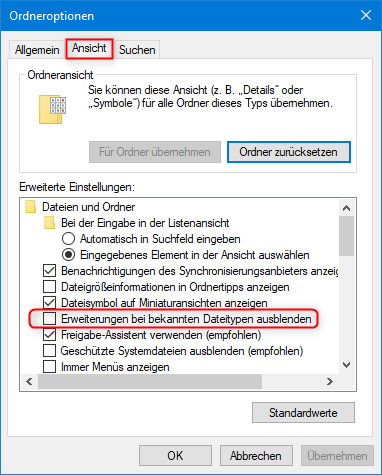 Öffne den Dateiexplorer, am schnellsten geht es unter Windows mit der Tastenkombination Win+E. Gehe dann ganz oben im Fenster auf die Registerkarte Ansicht, dann rechts auf Optionen und dort öffnet sich dann das Fenster Ordneroptionen. Gehe in diesem Fenster auf die Registerkarte Ansicht und suche nach der Einstellung Erweiterungen bei bekannten Dateitypen ausblenden, um den Haken davor zu entfernen.