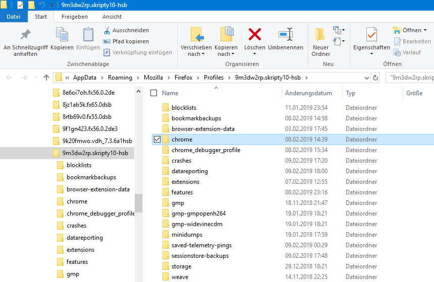 Firefox springt jetzt in dein Profil und zeigt dir dessen Ordner und Dateien im Dateiexplorer an. Standardmäßig sollte es, wie bereits oben erwähnt, schon den Unterordner chrome geben. Siehe folgendes Bildschirmfoto: