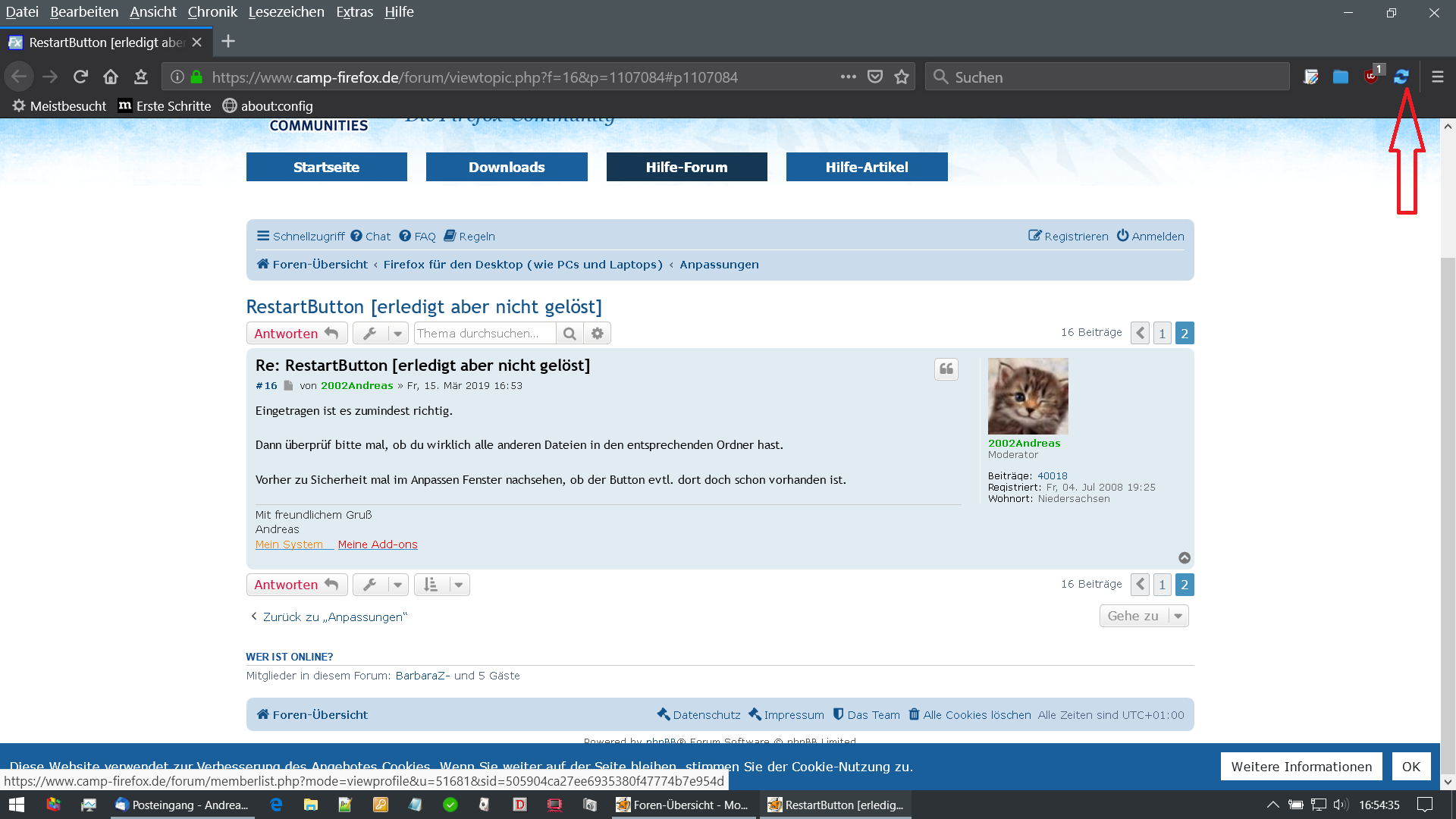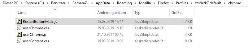 Ist es möglich, einen RestartButton über die userChrome zu erzeugen, den ich dann über Anpassen mir dort hinterlegen kann, wo es für mich am sinnvollsten erscheint?