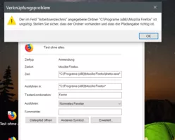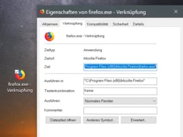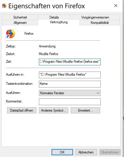 @grünerfuchsDen Ort der firefox.exe kannst du anhand der Orginalverknüpfung sehen. Dazu dort mit Rechtsklick Eigenschaften öffnen.