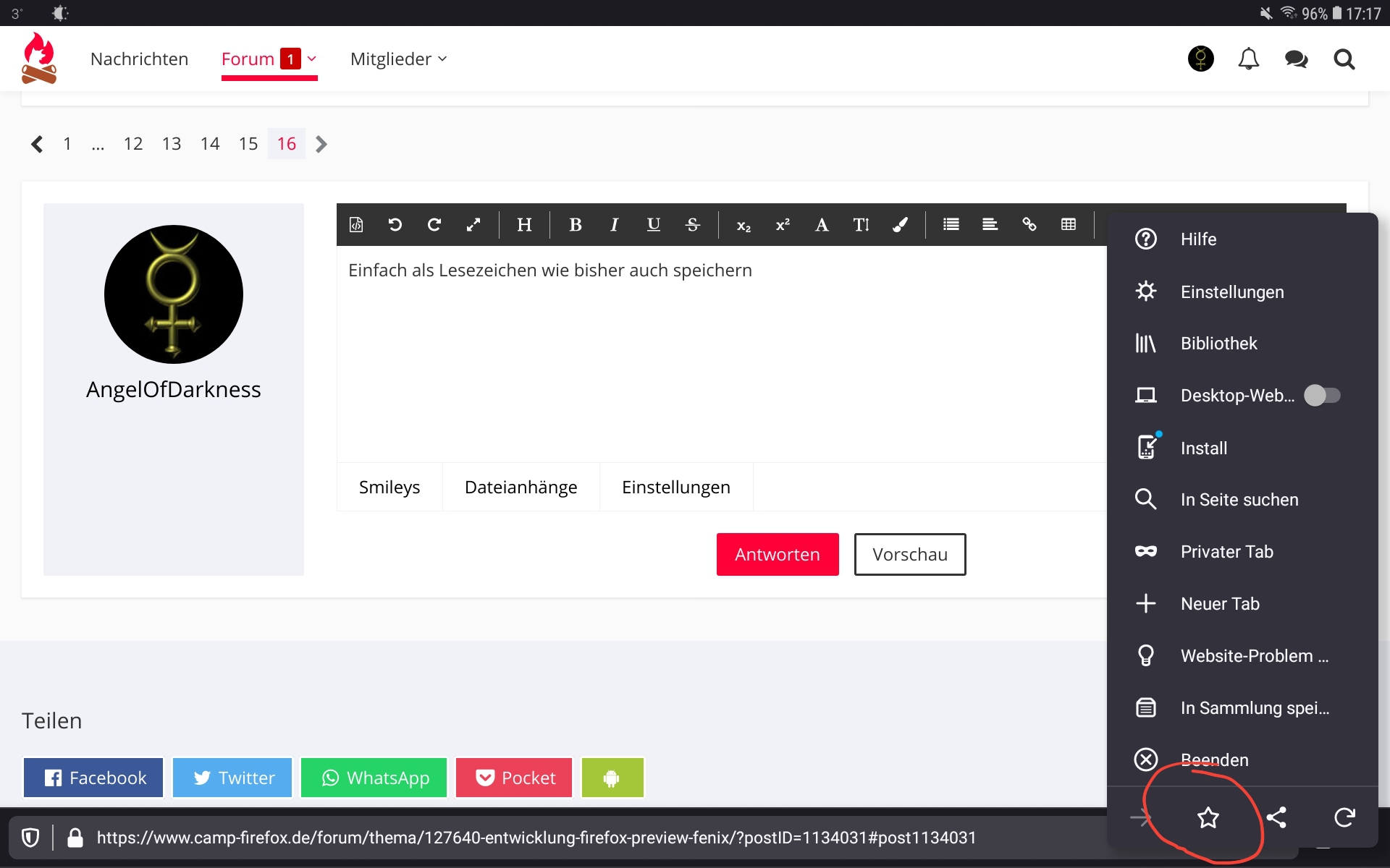 Wie muss ich am mobilen Gerät die Lesezeichen speichern (FF für Android und FF Preview), sodass sie am Desktop FF im Mobile Lesezeichen synchronisiert werden?