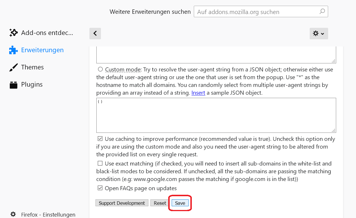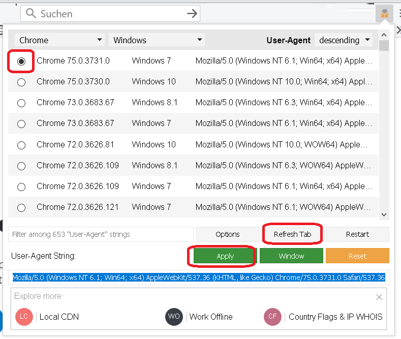 Welche Einstellung muss ich den beim User Agent Switcher vornehmen?