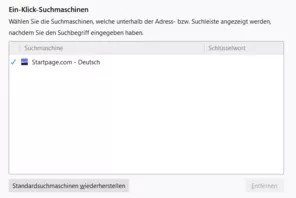 Wenn Du in den Einstellungen Startpage als Standardsuchmaschine vorgegeben hast, kannst Du im Einstellungsfenster den Haken vor Startpage entfernen.