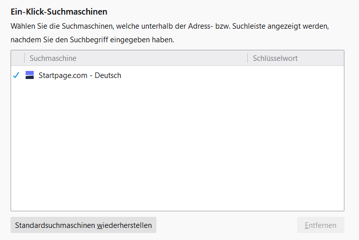 Dann erscheint das Auswahlfenster im Browser nicht mehr. Muß es auch nicht, die Suchmaschine ist ja festgelegt.