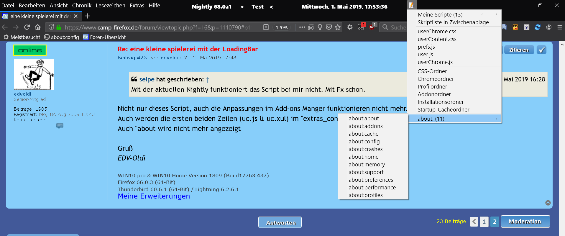 Mit der aktuellen Nightly funktioniert das Script bei mir nicht. Mit Fx schon.