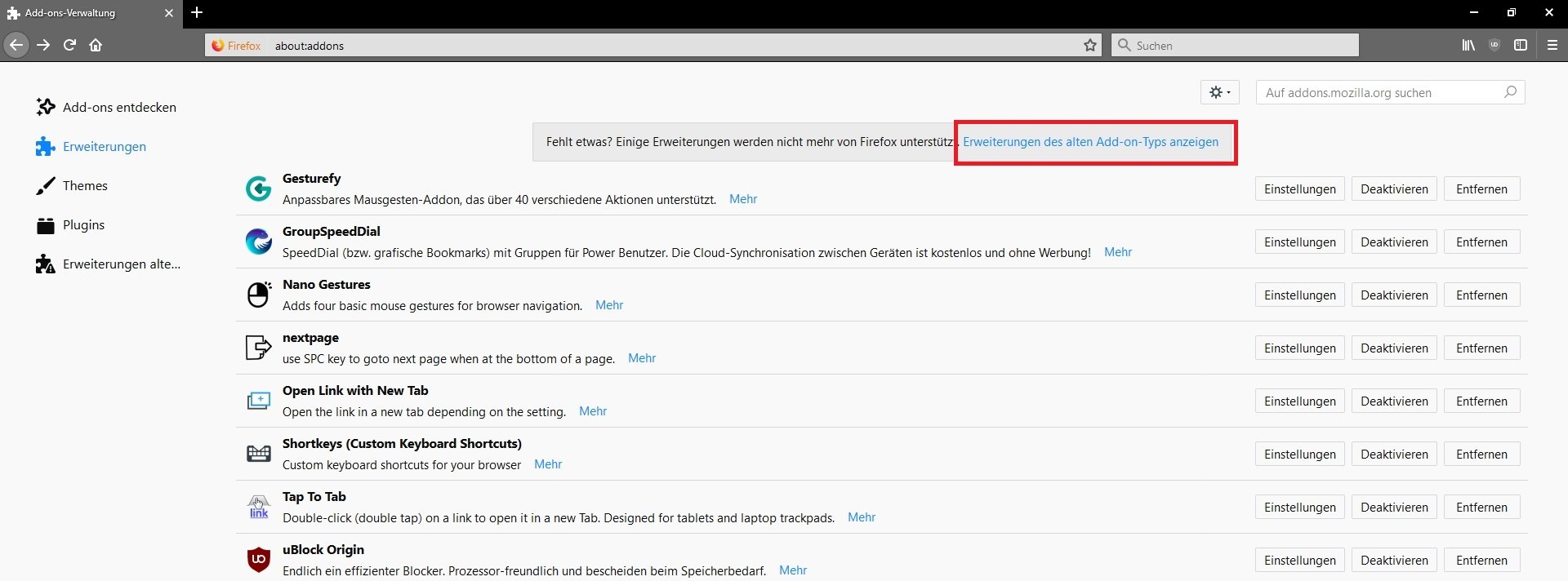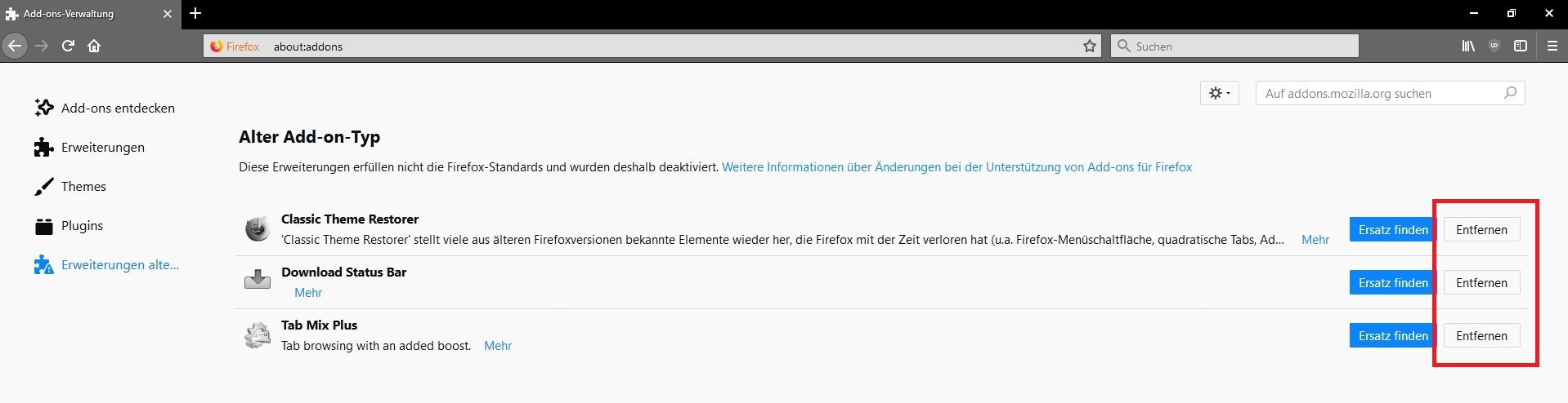 wie deinstalliert man richtig und vollständig deaktivierte Erweiterungen, die unter Nicht unterstützt (Alter Add-on-Typ) aufgeführt sind?