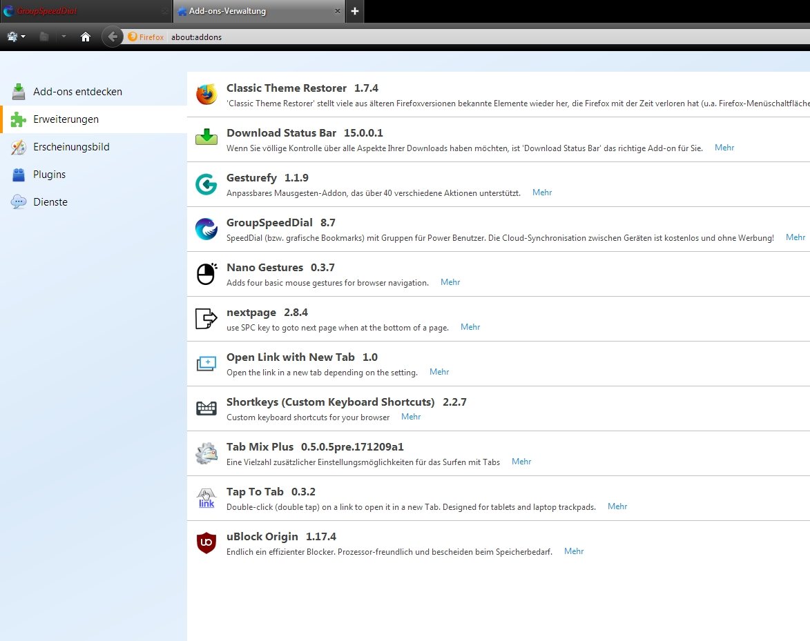• Ältere Versionen von FF , hier 56.0b und die veralteten Addons unter Windows 7