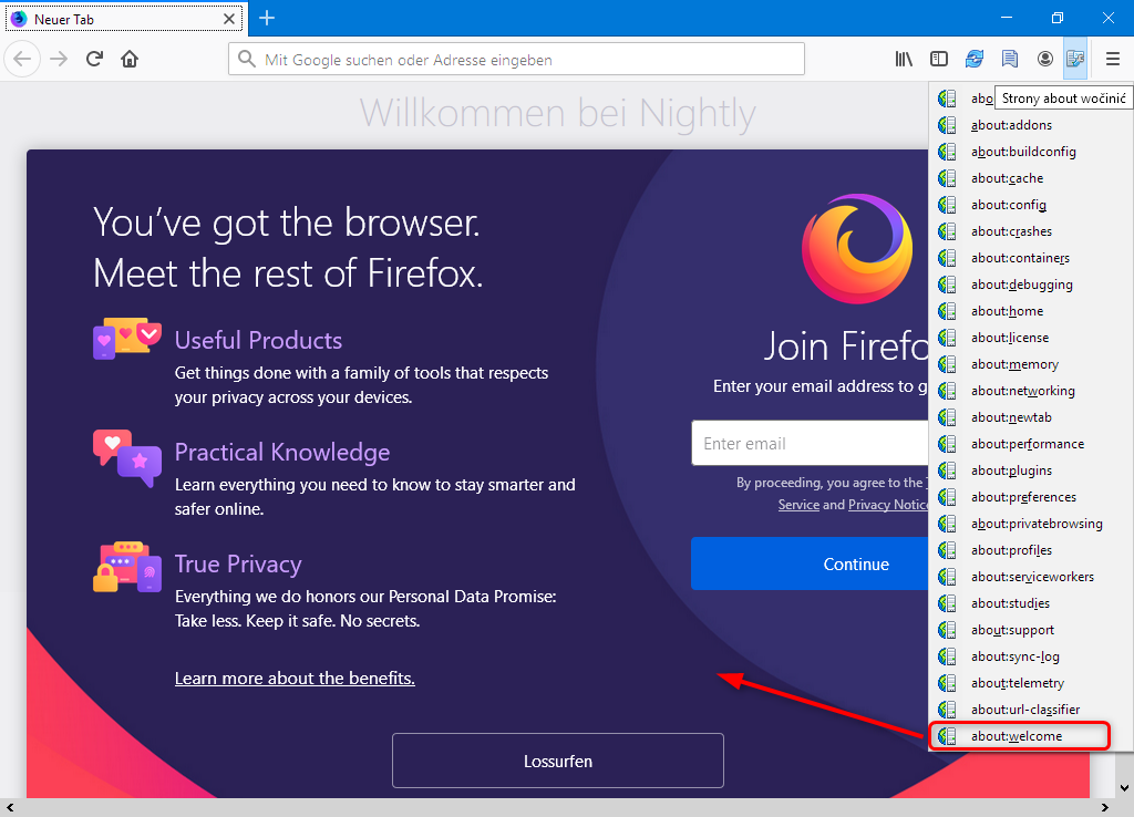 Die Seite about:welcome gibt es bereits seit Firefox 62. Nur der Inhalt hat sich jetzt geändert, für den sogenannten "Trailhead"-Release Firefox 67.0.5.